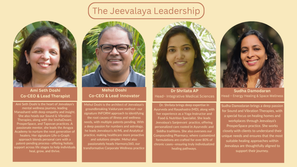 Ami Seth Doshi is the heart of Jeevalaya’s mental wellness journey, leading Manashanti with deep empathy and insight. She also heads our Sound & Vibration Therapies, along with the SnehaDwani, ProsperSpace, and Tapovan practices. A passionate mentor, she leads the Arogya Academy to nurture the next generation of healers. Her signature Life-o-Graph approach blends personal care with a patent-pending process—offering holistic support across life stages to help individuals heal, grow, and thrive.